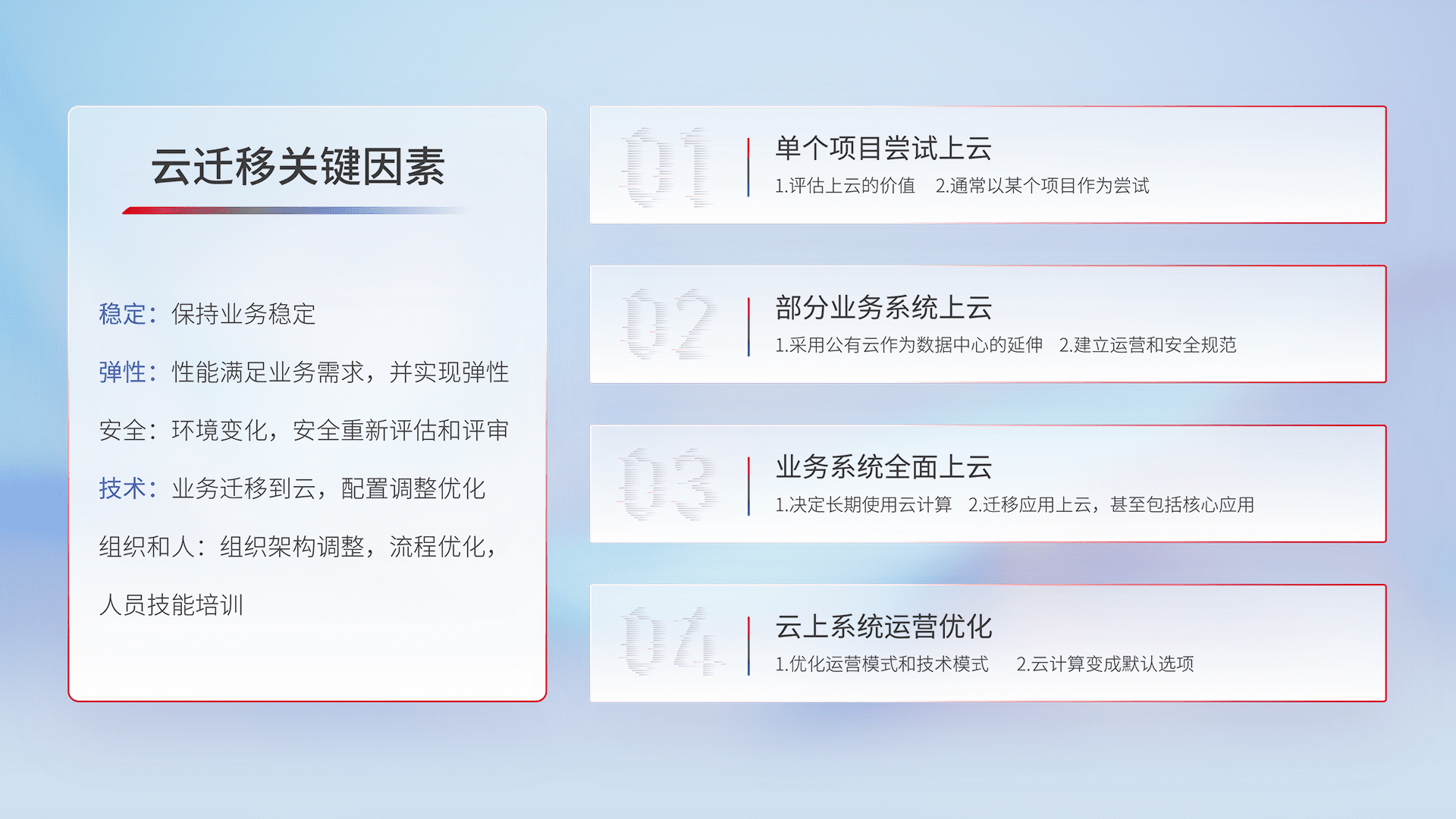 结合实际业务,,从规划设计、、、云平台选型、、、云原生改造、、、数据迁移、、、、集成交付,,迁移全过程为客户识别最佳上云路径,,,,做好风险识别管理,,,设计网络架构、、、身份权限、、、安全审计合规、、、操作审计、、、、日志审计、、、、监控告警策略、、、多站点容灾设计等,,对云上基础设施进行整体规划,,,,提升IT治理水平,,,以满足弹性、、、高可用、、、高性能的需求。。。